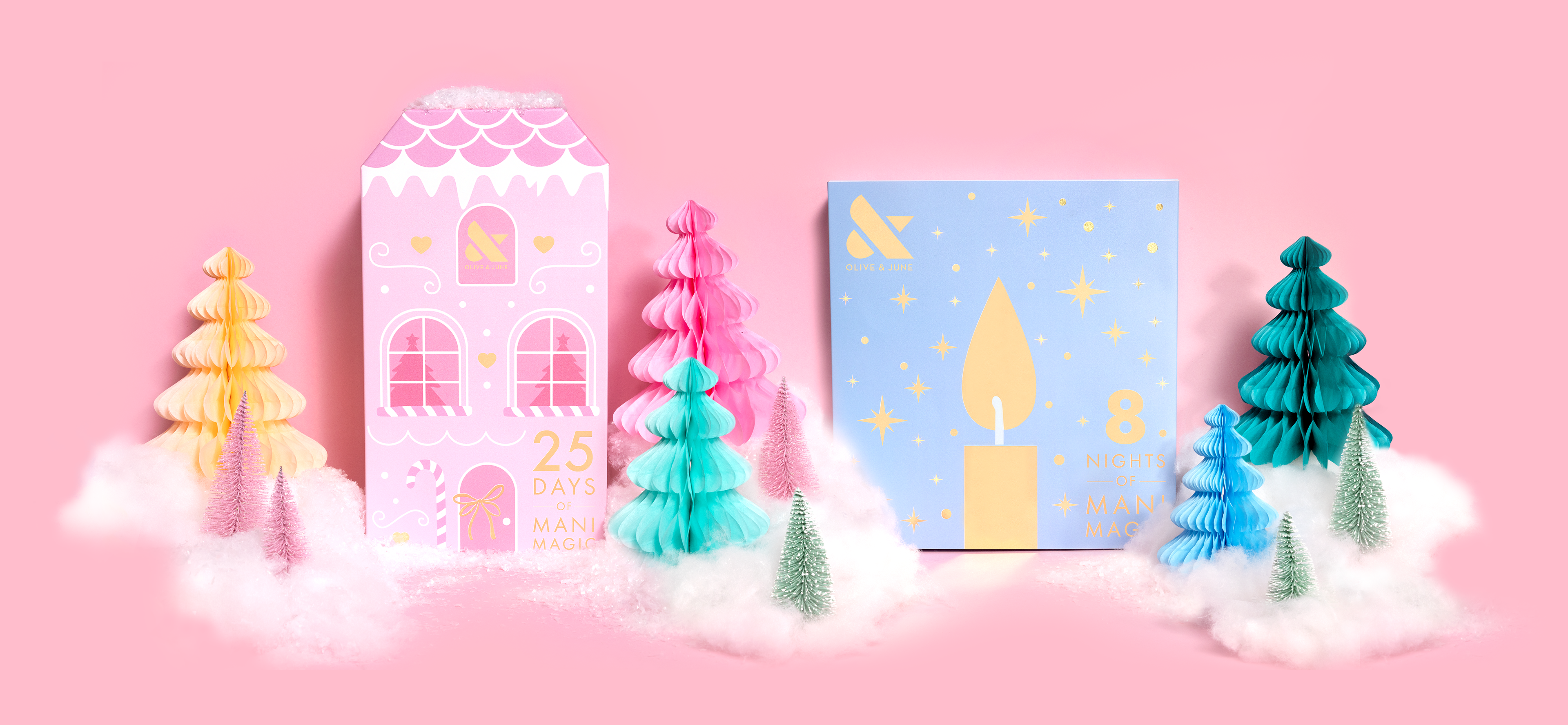 The left is an example of the mani system boxes designed as the center of the collection each season. The right is an influencer mailer designed for the Heart Defensor collab with Olive & June.